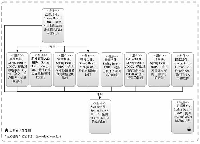 如容器图所示,“技术部落”包含一个从Twitter、GitHub和博客拉取内容的独立进程。就组件而言,下图展示了内容更新器高层次的内部结构。 “技术部落”—组件—内容更新器独立Java进程 除了一些核心组件(见下),内容更新器由四个组件组成:一个计划内容更新器,一个Twitter连接器,一个GitHub连接器和一个新闻订阅连接器。这张图展示了内容更新器如何拆分为组件,这些组件是什么,它们的职责以及技术/实现细节。这里是核心组件。