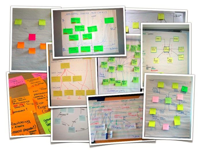 用便利贴和索引卡替代绘制框图可以带来一定的灵活性。如果你使用一种类-职责-协作2 式技术来识别候选的类/组件/服务,可以把所得的卡片作为开始创建你的图表的一种方式。