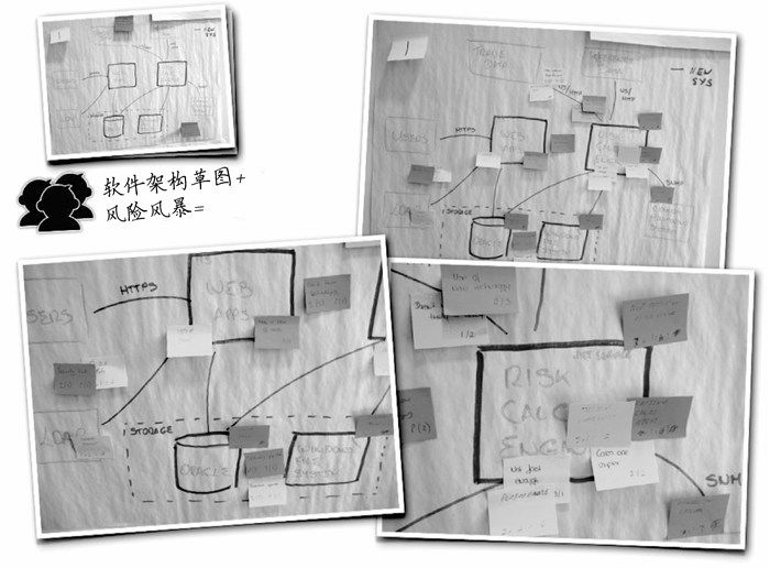 接下来,请大家把自己的便利贴贴在架构图上,邻近风险被识别出的区域。举个例子,如果你识别出一个组件会有运行过慢的风险,就把便利贴贴在架构图中那个组件的上方。 汇总图中的风险 这种技术的这个部分是视觉的,一旦完成,你就能一眼看到风险最高的区域在哪里。如果有人识别出类似的风险,随着大家想法的汇总,图的上方会贴满便利贴。