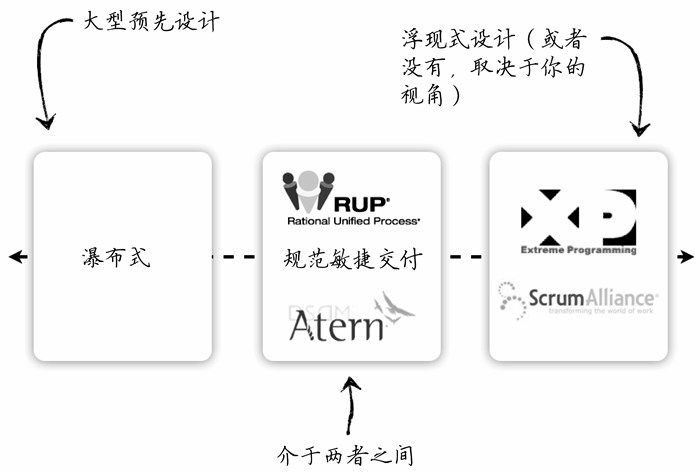 两头中间的是像Rational统一过程(RUP)1 、规范敏捷交付(DAD)2 和动态系统开发方法(DSDM)Atern3 这样的方法。这些是灵活的过程框架,实现中可以全部或部分采用。尽管RUP实现往往是与瀑布式方法有更多共同点的重量级怪物,它也可以缩减规模,呈现出能让它占据中心地带的特征组合。DAD基本上是一个精简版的RUP,而DSDM Atern则是一个类似的迭代和增量方法,也受到敏捷运动的影响。三者都是风险驱动的方法学,基本上就是“集中主要的高层次关键需求,规避风险,然后迭代和增量”。DSDM Atern甚至使用术语“坚实的基础”来形容这一点。做对了,这些方法就能在预先设计和演化架构之间达到良好的平衡。