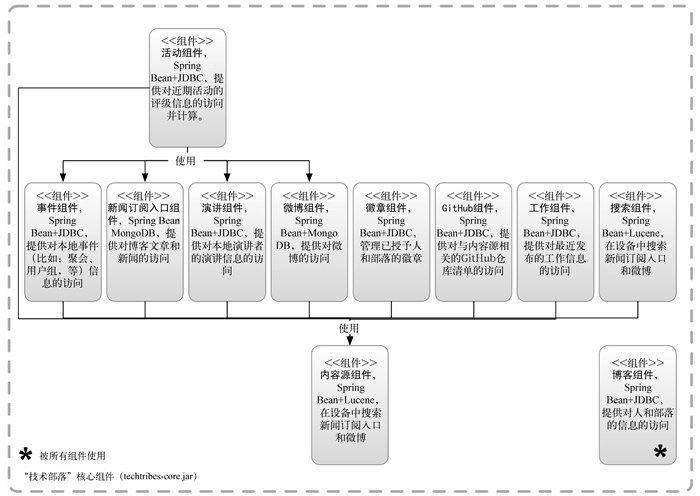 - 活跃度组件 :该组件提供对MySQL中存储的,内容更新器计算得到的“最近活跃”信息的访问。代码请看je.techtribes.component.activity23 。