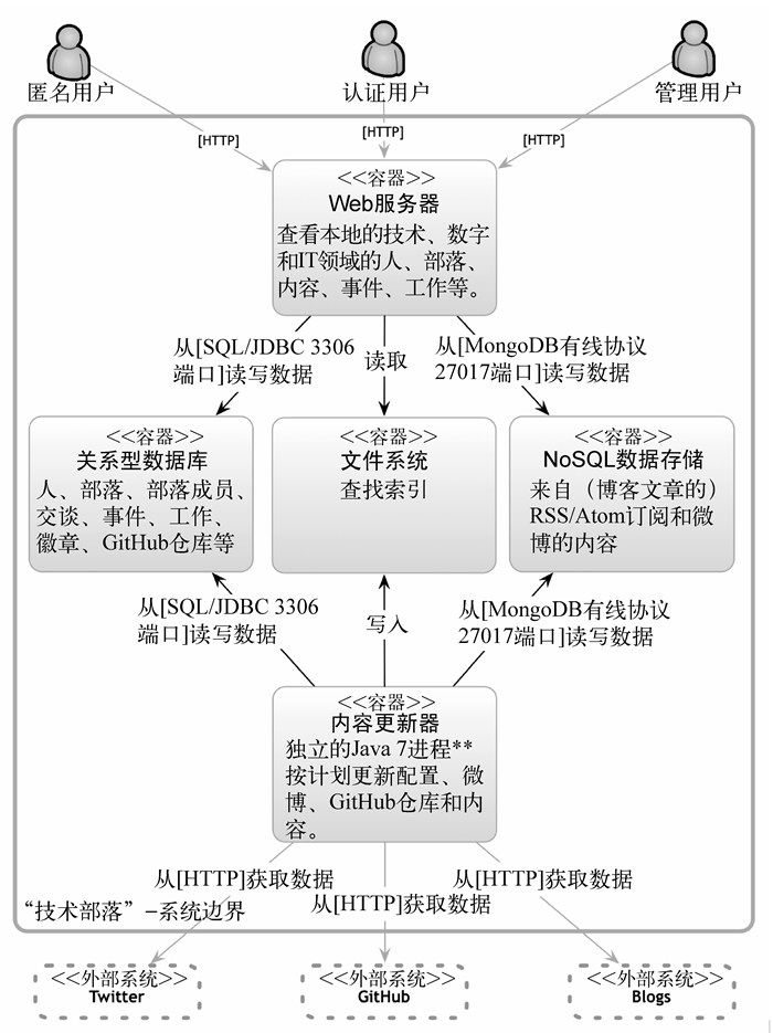 下图展示了组成“技术部落”系统的逻辑容器。图并不代表容器的实际数量和位置:这个信息请看基础设施和部署部分。