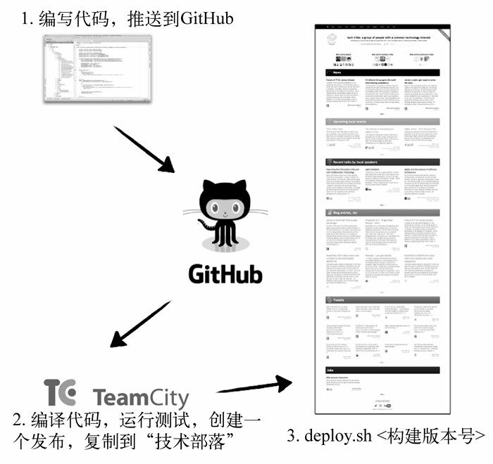 “技术部落”所有的软件都安装在~techtribesje/buiulds目录下,每个发布一个子目录34 。GitHub上有几个脚本35 ,用来解压一个发布,通过symlinks36 切换版本,最后重启进程。