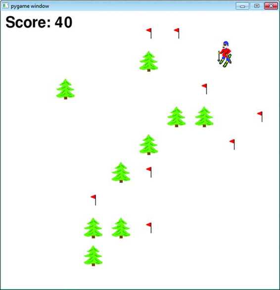 还有一点需要指出……使用计算机最有趣的就是玩游戏,游戏中的图像和音效对小孩子尤其有吸引力。我们将要学习如何编写自己的游戏,在这个过程中还会利用图形和声音做很多工作。下面就是我们将要开发的一些程序的屏幕截图。 不过,我认为(或者说我希望),就像让飞船和滑雪的角色在屏幕上移动一样,你会发现学习这些基础知识并着手编写第一个程序同样很有趣。 祝你玩得开心!