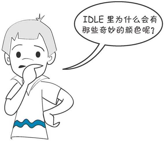 这个问题问得好! IDLE 想帮你更好地理解这些内容。它用不同的颜色显示文本,便于你区分代码(code)的不同部分。(在 Python 之类的语言中,代码就是下达给计算机的指令,这只是指令的另一个叫法。)本书后面我会慢慢解释这些不同部分究竟是什么。