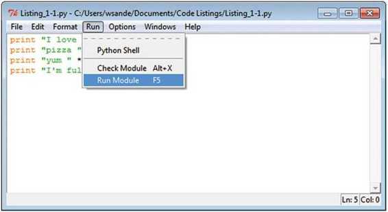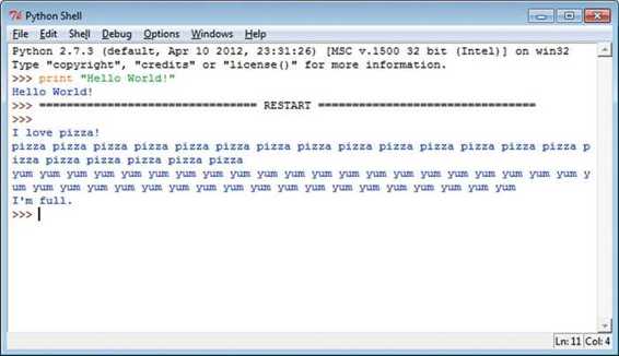 保存了你的程序之后,就可以选择 Run(运行)菜单(还是在 IDLE 编辑器中),再选择 Run Module(运行模块),如下图所示。这样就能运行你的程序了。 Python Shell 窗口(就是启动 IDLE 时出现的那个窗口)再次变成活动窗口,并会显示下面的结果。 RESTART 部分表明已经开始运行一个程序。(如果你在反复运行程序来进行测试,这会很有帮助。) 然后程序开始运行。当然,这个程序确实没太大用处。不过起码你能让计算机听从你的号令了。随着学习的深入,我们的程序会越来越有意思。