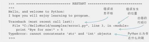 Traceback 开头的代码行表示错误消息开始。下一行指出哪里发生了错误,这里会给出文件名和行号。然后显示出错的代码行,这可以帮助你找到代码中哪里出了问题。错误消息的最后一部分会告诉你 Python 认为存在什么问题。对编程和 Python 有了更多了解之后,就更容易理解这个消息是什么意思了。