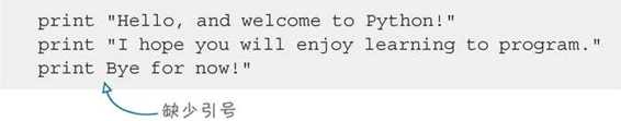 如果运行这个程序,IDLE 会弹出一个消息“There's an error in your program: invalid syntax.”,意思是说你的程序中有一个错误,语法不正确。你必须查看代码,找出哪里出了问题。IDLE 的编辑器会(用红色)突出显示它认为出错的位置。也许问题不会恰好出现在红色显示的位置,不过应该很接近。