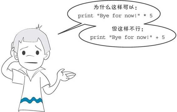 在 Python 中,不能把两个完全不同的东西加在一起,比如说数字和文本。正是因为这个原因,print "Bye for now!" + 5 会给出错误消息。这就像是在说:“5 个苹果加 3 只鳄鱼是多少?”结果是 8,但是 8 个什么呢?把这些东西加在一起没有任何意义。不过几乎所有东西都可以乘以一个数来翻倍。(如果有两只鳄鱼,再乘以 5,那你就会有 10 只鳄鱼!)正因如此,print "Bye for now!" * 5 是可以的。