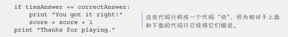 if 行末尾的冒号告诉 Python 下面将是一个指令块。这个块包括从前面的 if 行以下直到下一个不缩进的代码行之间的所有缩进代码行。