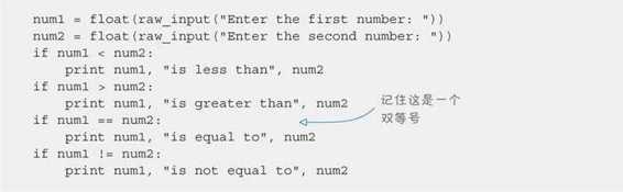 代码清单 7-1 显示了一个使用比较的示例程序。先在 IDLE 编辑器中创建一个新文件,键入这个程序并保存,把它命名为 compare.py。然后运行这个程序。试着用不同的数运行多次。可以试试不同的情况,比如第一个数较大、第一个数较小,以及两个数相等,看看会得到什么结果。