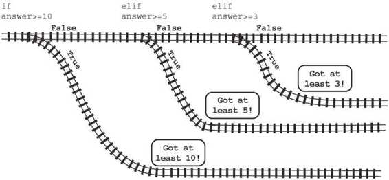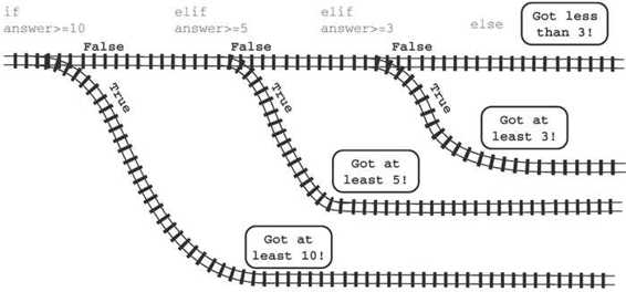 if answer >= 10: print "You got at least 10!"elif answer >= 5: print "You got at least 5!"elif answer >= 3: print "You got at least 3!"