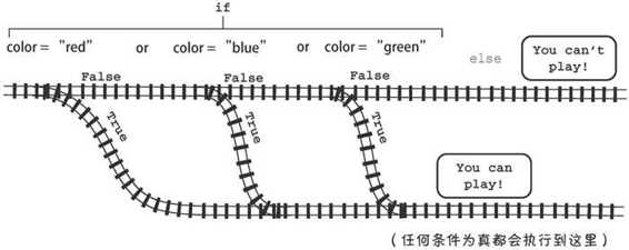 or 关键字也是用来把多个条件放在一起。如果使用 or,只要任意一个条件为真,就会执行代码块。 color = raw_input("Enter your favorite color: ")if color == "red" or color == "blue" or color == "green": print "You are allowed to play this game."else: print "Sorry, you can't play the game."