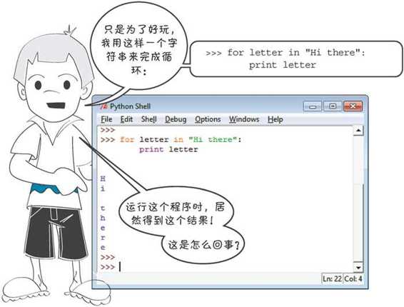 嗯,卡特,你已经发现字符串的一些规律了。字符串就像一个字符列表,我们已经学过:计数循环使用列表来完成迭代。这说明,也可以利用一个字符串来循环。字符串中的每个字符对应循环中的一次迭代。所以,如果打印循环变量(在这个例子中卡特把他的循环变量取名为 letter),就会打印出这个字符串中的所有字母,一次打印一个字母。因为每个 print 语句都会换行,所以每个字母分别打印在单独的一行上。