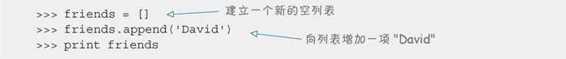 要向列表增加元素,需要使用 append。在交互模式中试试下面的代码: 你会得到这样的结果: ['David'] 再来增加一个元素: >>> friends.append('Mary')>>> print friends['David', 'Mary'] 记住,向列表增加元素之前,必须先创建列表(可以是空列表,也可以非空)。这就像在做一个蛋糕:不能直接把各种配料倒在一起,而是先将配料倒入碗中,不然肯定会弄得到处都是!