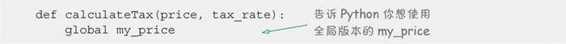 上一节中,我们看到,如果试图从函数内改变一个全局变量的值,Python 会创建一个新的局部变量。这是为了防止函数无意地改变全局变量。 不过,有些情况下确实要在函数中改变一个全局变量。这该怎么做呢? 可以用 Python 的一个关键字 global 来做到。可以这样来使用: 如果使用 global 关键字,Python 不会建立名为 my_price 的局部变量,而是会使用名为 my_price 的全局变量。另外,如果还没有名为 my_price 的全局变量,Python 就会创建一个。
