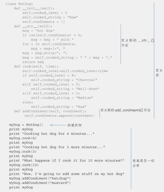 代码清单 14-6 包含 cook、add_condiments 和 __str__ 的 HotDog 类