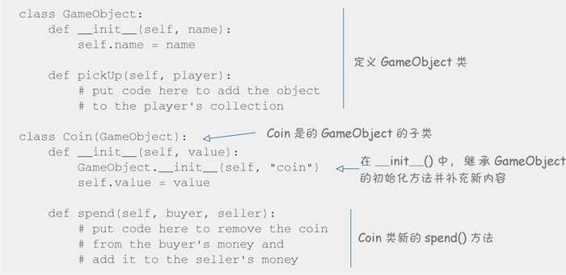 然后,可以为硬币建立一个子类。Coin 类从 GameObject 派生。它要继承 GameObject 的属性和方法,所以 Coin 类会自动有一个 name 属性和 pickUp 方法。Coin 类还需要一个 value 属性(这个硬币价值多少)和一个 spend 方法(可以用这个硬币去买东西)。