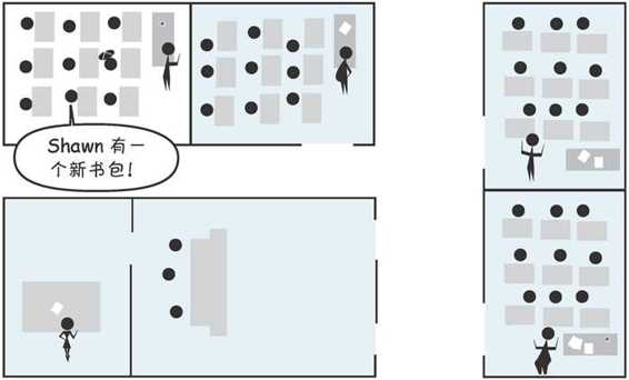假设在你们学校,你在 Morton 老师的班里,班里有个学生名叫 Shawn。现在 Wheeler 老师教的那个班也有一个名叫 Shawn 的学生。如果你在自己的班里说“Shawn 有一个新书包”时,你们班的所有人都会知道(或者至少他们会认为),你指的是你们班的 Shawn。如果你想说另外那个班的 Shawn 就会说“Wheeler 老师班里的 Shawn”或者“另外那个 Shawn”,或者其他类似的说法。
