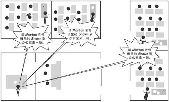 现在,如果校长必须通过学校的广播系统把 Shawn 叫到办公室,她不会说“请 Shawn 到办公室来一趟”。如果她这样做,两个 Shawn 都会出现在他的办公室。对于使用广播系统的校长来说,命名空间是整个学校。这说明,学校的每一个人都会听到这个名字,而不只是一个班的同学。所以她必须更明确地指出她指的是哪一个 Shawn。她必须这样说:“请 Morton 老师班里的 Shawn 到办公室来一趟。”