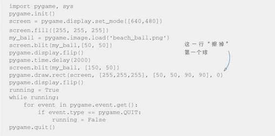 我们增加了第 10 行,在第一个沙滩球上画了一个白色矩形。沙滩球图形大约 90 像素宽 90 像素高,所以白色矩形的大小就是 90 像素宽、90 像素高。如果运行代码清单 16-12 中的程序,看起来沙滩球会从它原来的位置移到新位置。