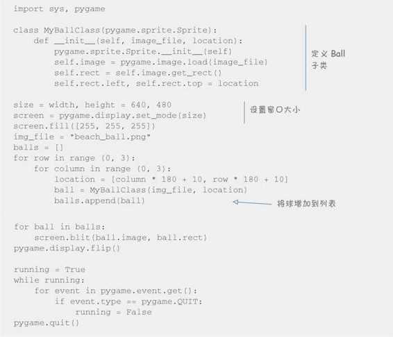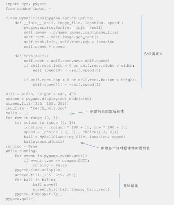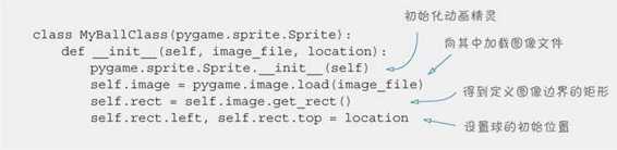 Pygame 的 sprite 模块提供了一个动画精灵基类,名为 Sprite。(还记得几章前讨论过的对象和类吗?)正常情况下,我们不会直接使用基类,而是基于 pygame.sprite.Sprite 来创建自己的子类。下面将完成这样一个例子,并把我们的类命名为 MyBallClass。创建这个类的代码如下:
