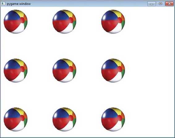 如果运行这个程序,会看到 9 个沙滩球出现在 Pygame 窗口中,就像右图显示的这样:
