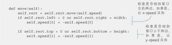 动画精灵(实际上是其中的 rect)有一个内置方法 move。这个方法需要一个 speed 参数来告诉它对象要移动多远(也就是移动多快)。因为我们处理的是二维(2D)图形,而 speed 是一个包含两个数的列表,一个对应 x-speed,另一个对应 y-speed。我们还要检查球是否碰到窗口的边界,使球能够在屏幕上“反弹”。