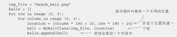 既然已经定义了 MyBallClass,接下来必须创建它的一些实例。(要记住,类定义只是一个蓝图;现在必须动手盖房子。)我们仍然需要和上一章同样的代码来创建 Pygame 窗口,另外还要在屏幕上创建一些球,按行列摆放。这要利用一个嵌套循环来完成: