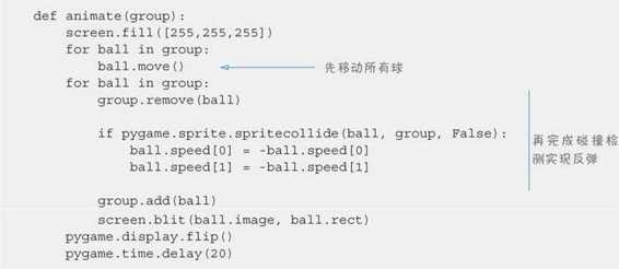 这些工作在第 21 行到第 29 行的 for 循环中(animate 函数的中间部分)完成。如果开始时没有从组中删除这个精灵,spritecollide 会检测到这个精灵与它自身发生了碰撞,因为它也在这个组中。乍一看好像有些奇怪,不过如果再想想看就会发现这是有道理的。