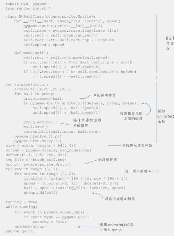 下面来完成一个例子。以我们的反弹沙滩球为基础,不过为了更容易地看出发生了什么,这里首先建立 4 个球而不是 9 个球。另外与上一个例子中建立球的列表不同,我们将会使用 Pygame 的 group 类。
