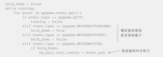 如何区分是否在拖动鼠标呢?拖动意味着鼠标移动时鼠标按钮一直保持按下。我们可以利用 MOUSEBUTTONDOWN 事件得到鼠标按钮何时按下,另外利用 MOUSEBUTTONUP 事件可以得到按钮何时松开(还原,不再按下)。因此只需跟踪按钮的状态,可以通过建立一个变量来做到,我们将这个变量命名为 held_down。具体做法如下: