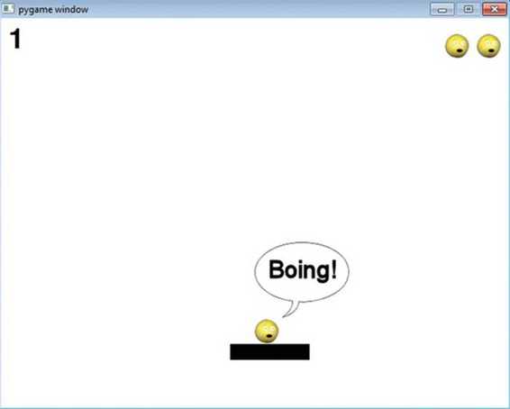 把这个代码添加到代码清单 18-5 的 PyPong 程序中。一定要把 hit_paddle.wav 文件复制到保存程序的同一个位置。运行这个程序时,每次球碰到球拍时你都会听到一个声音。