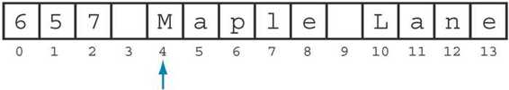 单词 Maple 从字符串 657 Maple Lane 的位置 4 开始。与列表一样,字符串中字母的索引(或位置)都是从 0 开始,所以 M 位于索引 4。