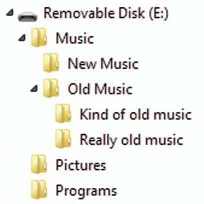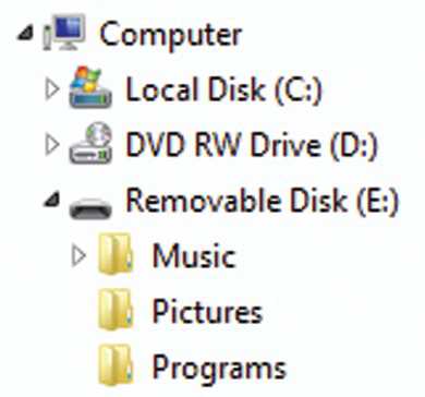 在 Windows 中,每个存储介质由一个字母表示,如C代表硬盘,E 对应一个闪存盘。在 Mac OS X 和 Linux 上,每个存储介质都有一个名字(例如,hda 或 FLASH DRIVE)。每个存储单元可以划分为多个文件夹,如 Music、Pictures 和 Programs。如果查看文件浏览器(如 Windows Explorer),就像下图这样: