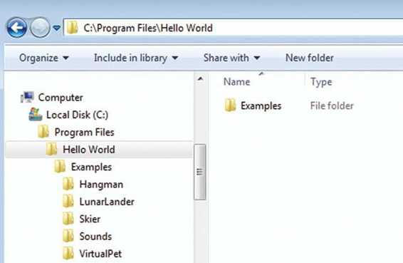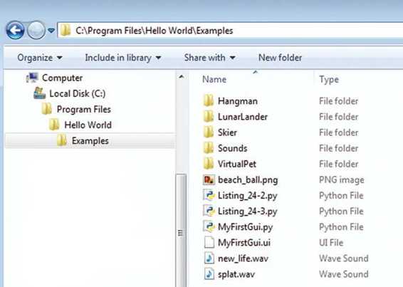 还记得吗?在第 19 章讲到关于声音的内容时,我们打开声音文件使用的是 splat.wav 之类的文件名,并没有使用路径。这是因为,那时我告诉你要把声音文件复制到保存程序的同一个文件夹中。如果在 Windows Explorer 中查看,就是这样: