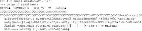 这说明不能对二进制文件使用 readline 或 readlines。例如,如果想要从一个 .wav 文件读取一“行”,你根本无法知道会得到些什么。大多数情况下,你可能会得出一大堆奇怪的东西,就像这样: