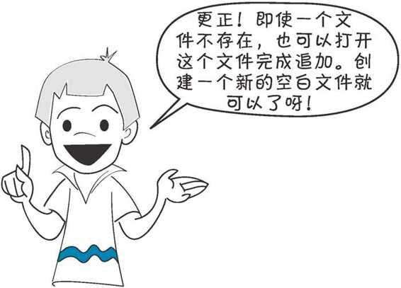 如果使用 \'a\' 表示追加模式,文件名必须是硬盘上某个已经存在的文件的名字,否则你会得到一条错误消息。这是因为,追加是指增加到一个现有的文件。