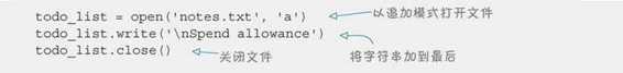 首先,还是使用前面创建的 notes.txt 文件,为它追加一些内容。下面增加一行“Spend allowance”。完成 readlines 例子时如果你仔细观察,可能已经注意到最后一行末尾没有 n,也就是说没有换行符。所以现在需要增加一个换行符,然后再增加我们的新字符串。要把字符串写入文件,需要使用 write 方法,如代码清单 22-3 所示。