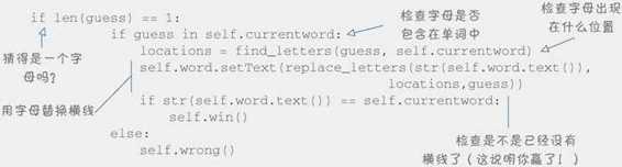 玩家猜一个字母时,程序会查看这个字母是否在秘密词中。如果确实是秘密词中的字母,就把这个字母显示出来。在窗口下方,玩家可以看见到目前为止他猜过的所有字母。玩家什么时候都可以尝试猜词。