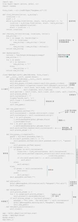 整个程序大约 95 行代码,另外我还加入了一些空行,让代码看起来更美观。代码清单 22-8 给出了整个程序,这里加了对各个不同部分做的一些解释。如果使用本书的安装程序,你的计算机上的 ExamplesHangman 文件夹中应该已经有这个代码了,另外也可以在网站上找到这个代码,包括 hangman.py、hangman.ui 和 words.txt。切记,正如我们在第 20 章提到的,如果你使用的是 Mac,则需要在 Qt Designer 中打开 hangman.ui,并勾选掉 menubar 对象的 nativeMenuBar 属性。