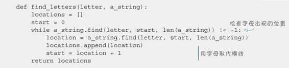 我们有几个函数来完成这项工作。find_letters 函数会查找某个字母在单词中出现的所有位置,并返回一个包含这些位置的列表。例如,对于字母 e 和单词 lever,这个函数会返回 [1, 3],因为字母 e 出现在这个字符串的索引 1 和索引 3 的位置上。(记住,索引从 0 开始。)代码如下:
