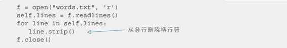 words.txt 文件只是一个文本文件,所以可以使用 readlines 读这个文件。为了从词汇表中选择一个词,我们使用了 random.choice 函数,如下: