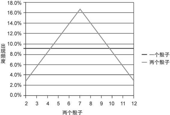 为什么会有这种差别?原因与概率有关,这是一个庞大的主题。基本说来,对于两个骰子,中间的数更常出现,这是因为掷两个骰子时有更多途径可以得到中间这几个数。