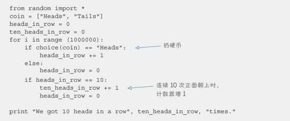 我们需要两个计数器。一个用于统计连续扔出多少个正面朝上,名为 heads_in_row。另一个用于统计连续 10 次正面朝上的情况出现多少次,名为 ten_heads_in_row。程序要做的工作如下: