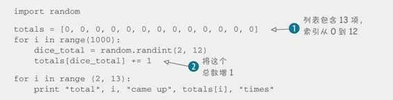得到一个结果时,我们将相应的列表项增 1。如果结果为 7,就将 totals[7] 增 1。所以 totals[2] 就是得到 2 的次数,totals[3] 是得到 3 的次数。依此类推。