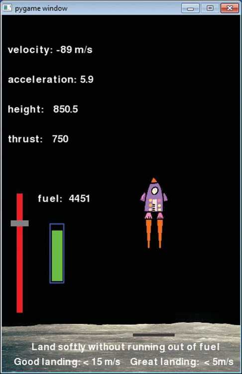 试着运行这个程序。没准你会发现自己是一个不错的飞船驾驶员!如果你认为 这太简单了,可以修改代码,让重力更大一些,使飞船更重(质量更大),或者减少 一些燃料,还可以设置一个不同的起始高度或速度。你是程序员,所以游戏该怎么 做由你来决定。