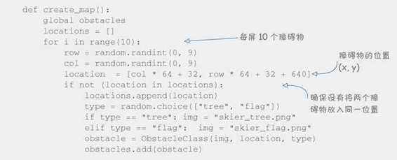 我们唯一需要当心的是,不要尝试将两个障碍物放在同一位置,所以我们需要知道哪些位置是已经使用过的。变量 locations 是一个用于记录使用过的位置的列表。当想要在某个位置放置一个新的障碍物时,我们首先要查看这个位置是否已有一个障碍物。
