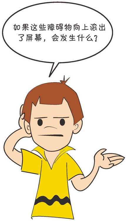 问得好。在当前的代码中,我们让它们继续在窗口上边界外向上滚动,这样其位置的 y 值(负值)绝对值会越来越大。如果游戏运行了比较长的时间,则会创建并积累大量的障碍物场景。这有可能会导致程序变慢或者在某个时间点发生内存不足的情况。所以我们需要做一点清理工作。