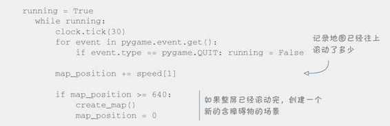 和创建的第一屏障碍物一样,我们还需要在窗口下方创建另外一屏的障碍物。那怎么知道应该在什么时候创建呢?我们可以创建一个名为 map_position 的变量,由它来告诉我们场景已经向上滚动了多少。我们在主循环中像下面这样处理。